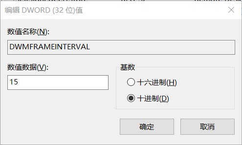 在空白处右键->新建->DWORD(32位)值,命名为DWMFRAMEINTERVAL。
