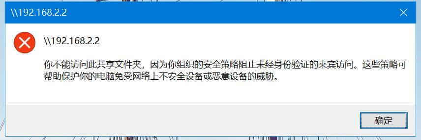 “你不能访问此共享文件夹,因为你组织的安全策略阻止未经身份验证的来宾访问。这些策略可帮助保护你的电脑免受网络上不安全设备或恶意设备的威胁。”