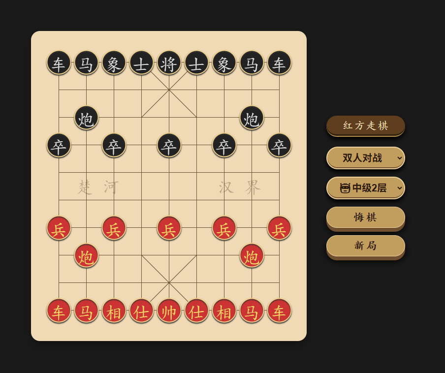 采用纯 HTML5 Canvas 实现,无需任何网络连接或插件,直接在浏览器中运行。它既支持双人对弈,也提供三种难度的人机对战,适合象棋爱好者练习或休闲娱乐。