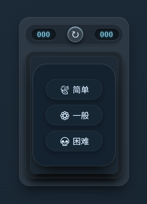 • 重启按钮(restart):圆形按钮,点击后弹出难度选择浮层,可随时开始新游戏。